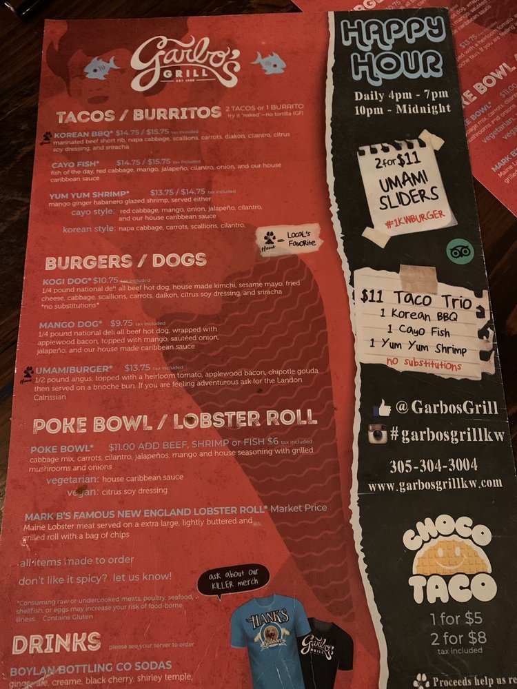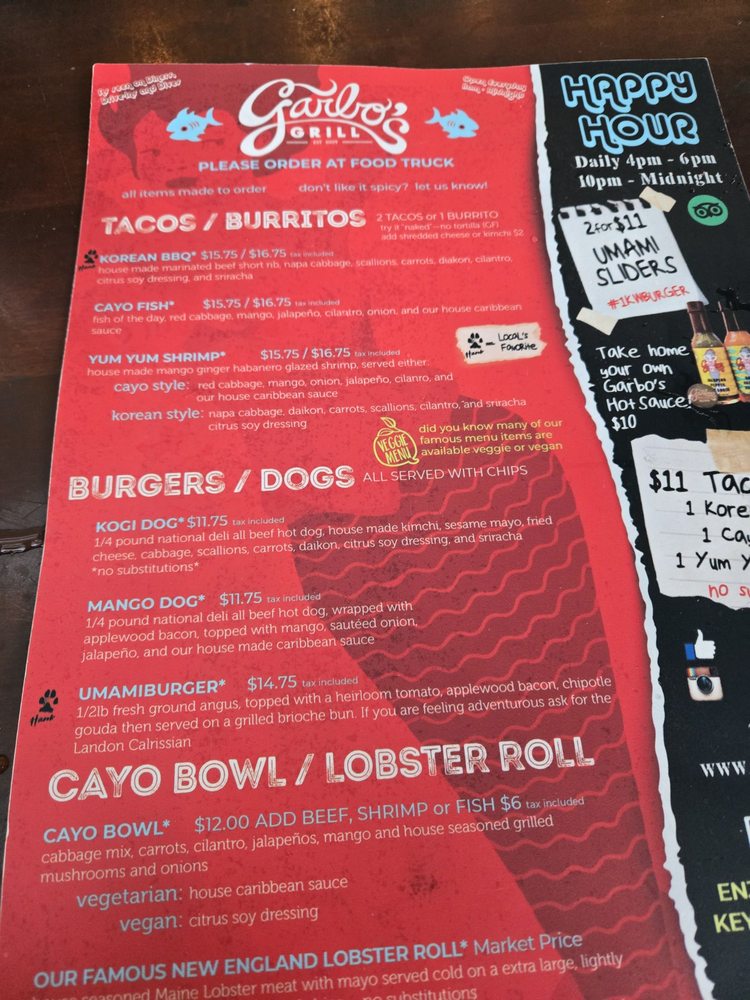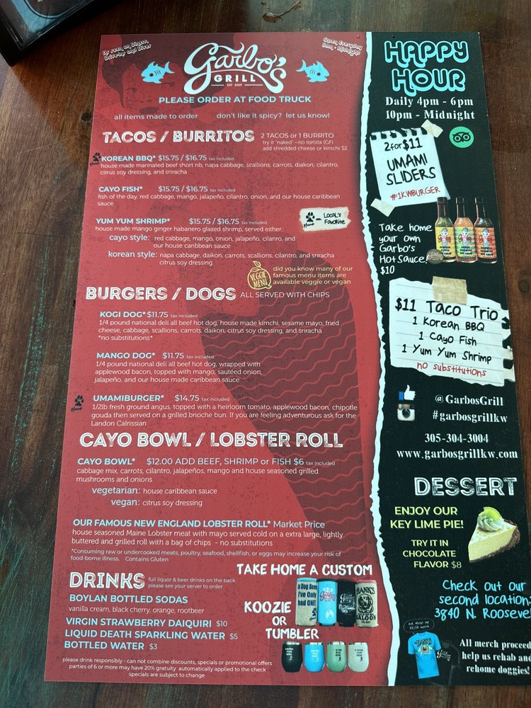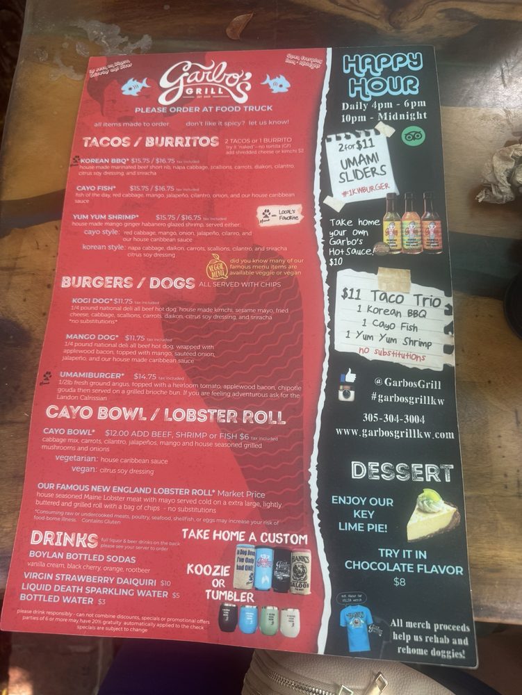 Garbo's Grill, located in Key West, FL, offers a unique dining experience with a food truck serving up exceptional tacos and burgers. Customers rave about the cayo fish tacos, Korean BBQ tacos, umami burger, lobster roll, and key lime pie. The outdoor seating, live music, and laid-back ambiance create a fun atmosphere for enjoying delicious food. The food truck shares space with Hank's Hair of the Dog, allowing guests to grab a drink from the bar to complement their meal. With generous portions, friendly service, and reasonable prices, Garbo's Grill is a must-visit for those looking for a tasty meal in a lively setting. The variety of menu options, happy hour specials, and vibrant music make this spot a favorite among visitors and locals alike.